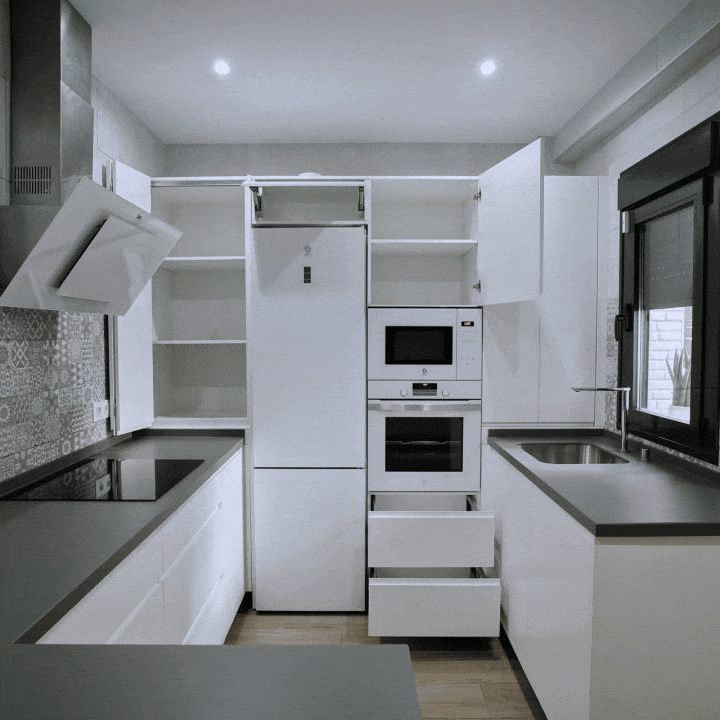 En esta en ocasión presentamos una cocina blanca mate con gola en el mismo color para caracterizar a dicho proyecto con un ambiente minimalista. Esta cocina se construye en un espacio totalmente separado del resto de la vivienda con dos frente diferenciados.